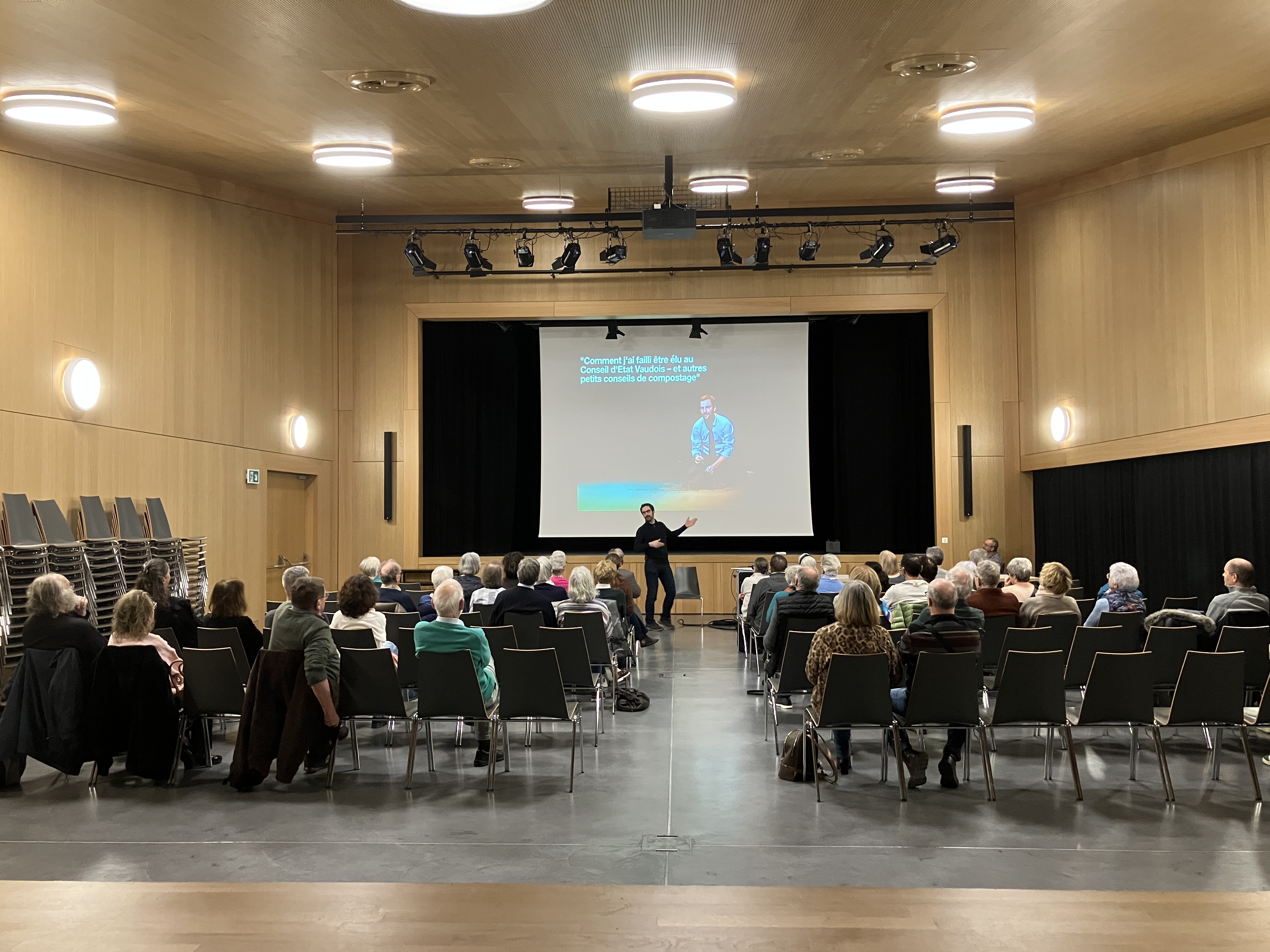 Invité par les Grands-Parents pour le Climat, le comédien et improvisateur vaudois Yvan Richardet a donné le 29 janvier 2025 une conférence à la salle des Utins où il est revenu sur son parcours artistique et son engagement pour l’environnement, le tout saupoudré d’une bonne dose d’humour et de rires.